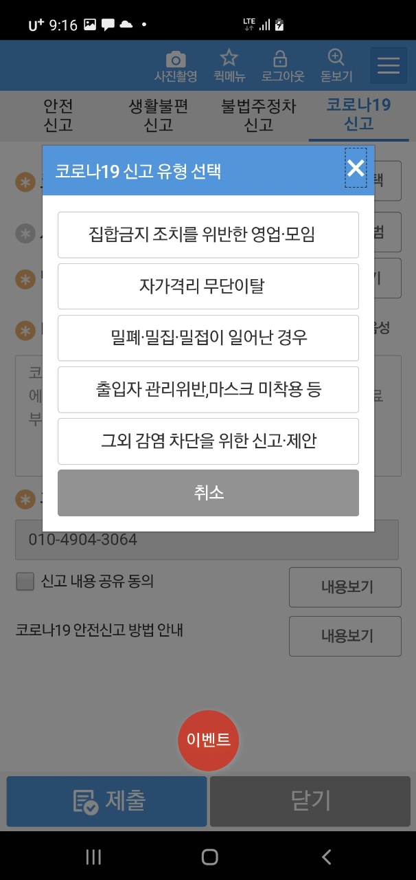 2. 신고하기 버튼을 누르고 코로나 신고를 합니다.